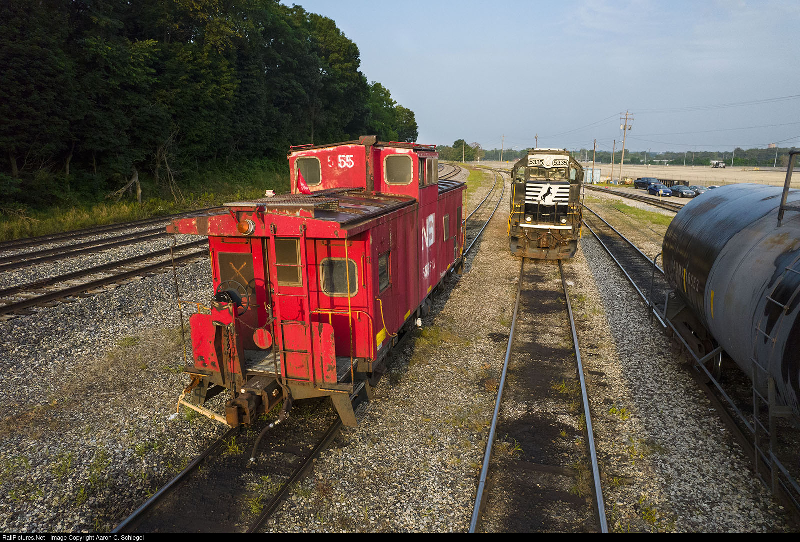 | Now commonly referred to as Shoving Platforms, Cabooses are still in use on many local and industry jobs in order to provide safety and a bit more comfort for Conductors having to shove long distance moves. NS 555618 sits in Hinman Yard for the B 57 job servicing the line between Battle Creek and Kalamazoo. |