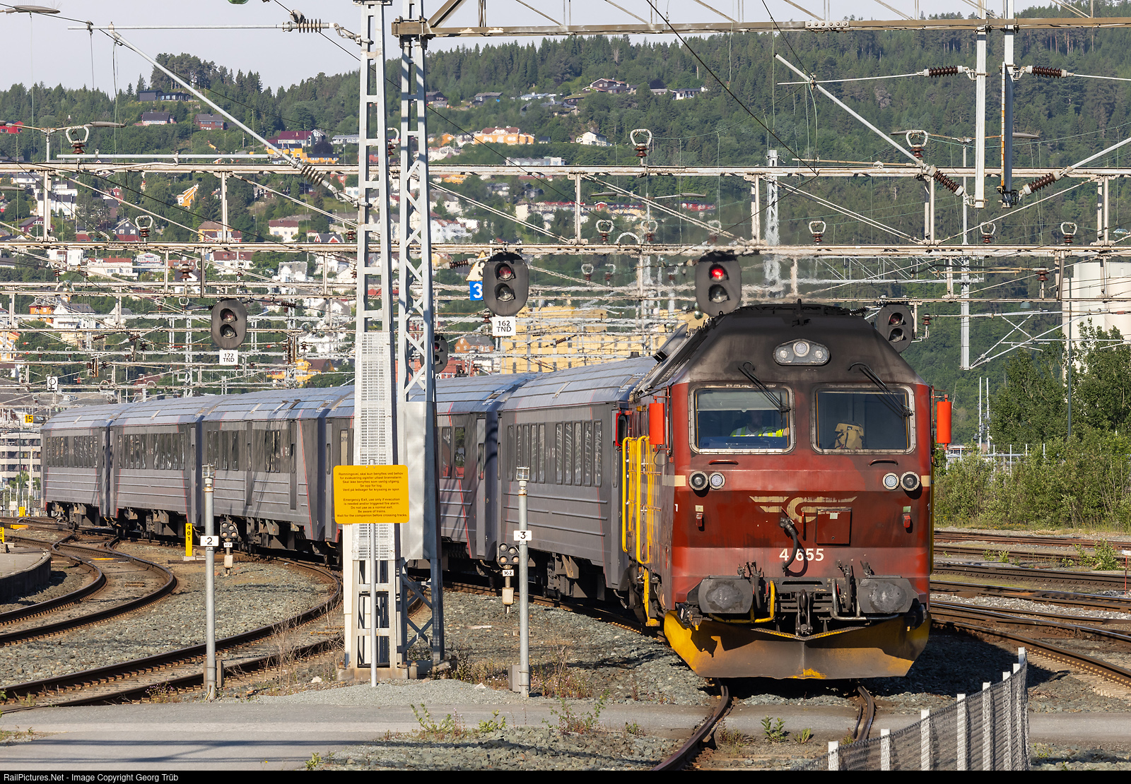 | 2450 kW diesellocomotive Di4 # 655 is entering Trondheim station from the stable tracks with train 471 over the nordland line to Bodø. 5 of this locomotives were built in 1980 by Henschel in Germany with an EMD 16-645E3B prime mover. All 5 locomotives (# 4.651 to 4.655) are now 42 years in daily service on the Nordlandsban. |