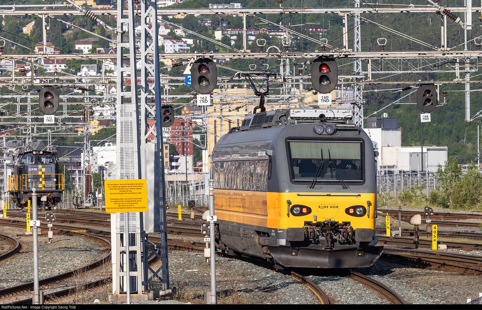 Infrastructure measuring vehicle "Roger 1000" of the Norwegian railroad infrastructure "Bane Nord" (formerly Jernbaneverket), 162 # 002, built by the Italian company Mermec in Monopoli near Bari/Italy, in Trondheim. The diesel-powered vehicle has a pantograph for measuring the catenary. The SBB has a very similar vehicle, see https://www.railpictures.net/photo/769671/
