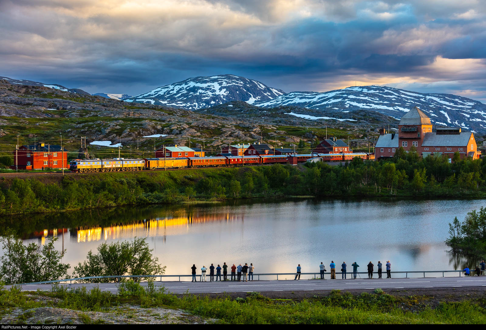 The famous electric locomotive Dm3 (1'D+D+D 1') #1246-1247-1248 "Oskar" formerly from the Swedish State Railways (Statens Järnvägar) is departing Vassijaure with a special evening train bound for Abisko Östra. On the occasion of the 120-year anniversary of the iron ore line "Malmbanan", the Swedish railway museum together with LKAB iron ore mining company ran several historical trains between June 30 and July 4 2022. This impressive electric locomotive was built by ASEA and delivered in 1970. It has a power output of 7,200 kW (9,700 hp). It now belongs to the Swedish railway museum in Gävle.