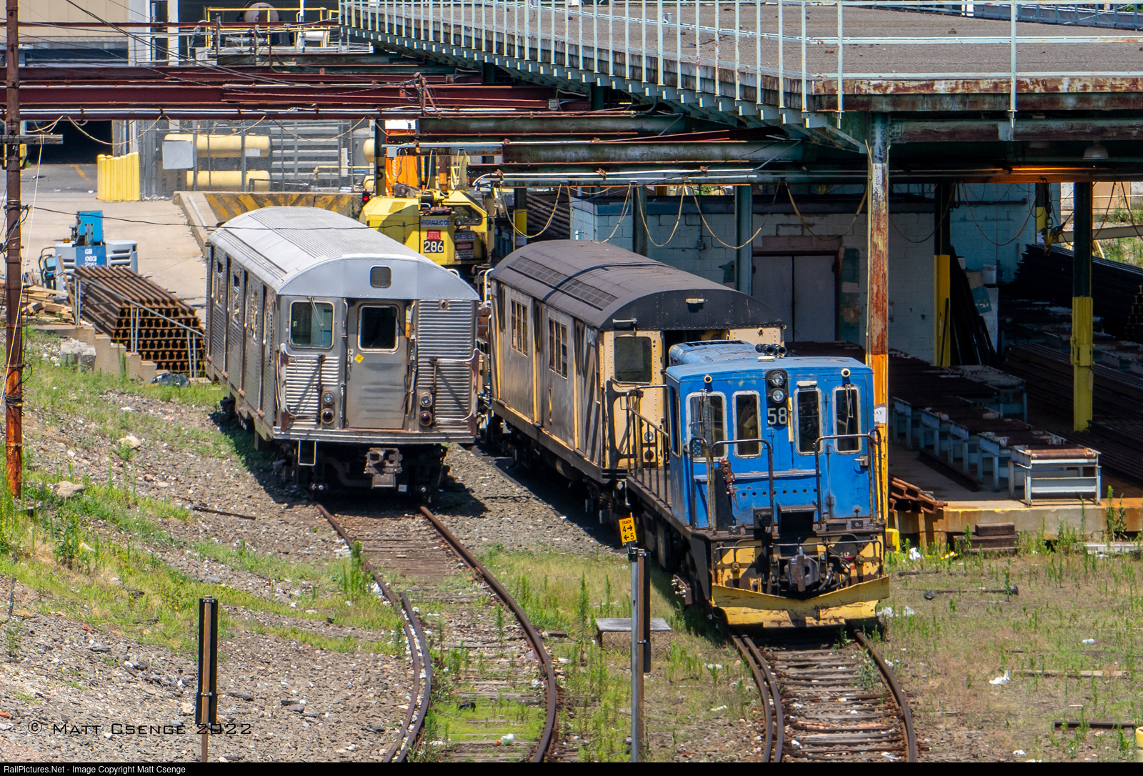 NYCTA R41 locomotive 58 (GE 45-ton, 1967-1968) and R32 3699 (Budd, 1964) sit on tracks 4 and 5 at 38th St Yard in Sunset Park, Brooklyn. These two pieces of equipment are both unique in their own ways: 58 is the only locomotive painted in this blue scheme (57 has a similar blue paint scheme, but not the same), and 3699 is the only single R32 car left on the property, as its mate was sold to a private owner.