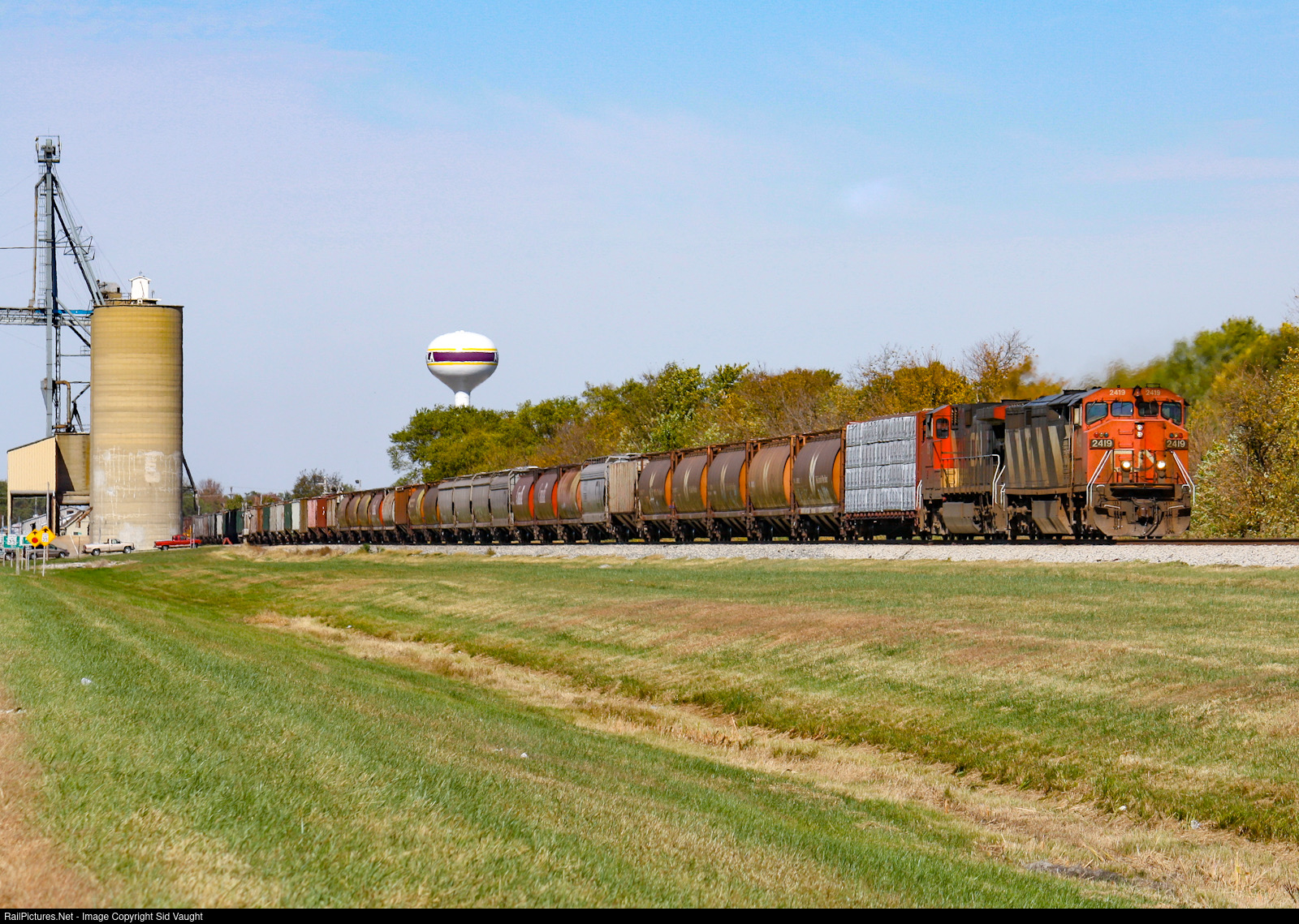 Southbound grain on the former ICRR appears to be supervised by a alien such as Gort in “The Day the Earth Stood Still”. Fear not, it’s just a water tower.
