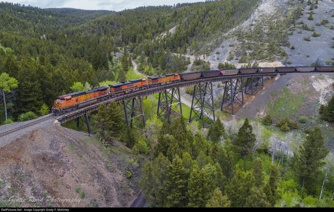 BNSF #4119 leads westbound Robert's Bank export coal loads from the Powder River Basin over the famous Skyline trestle on Mullan Pass.