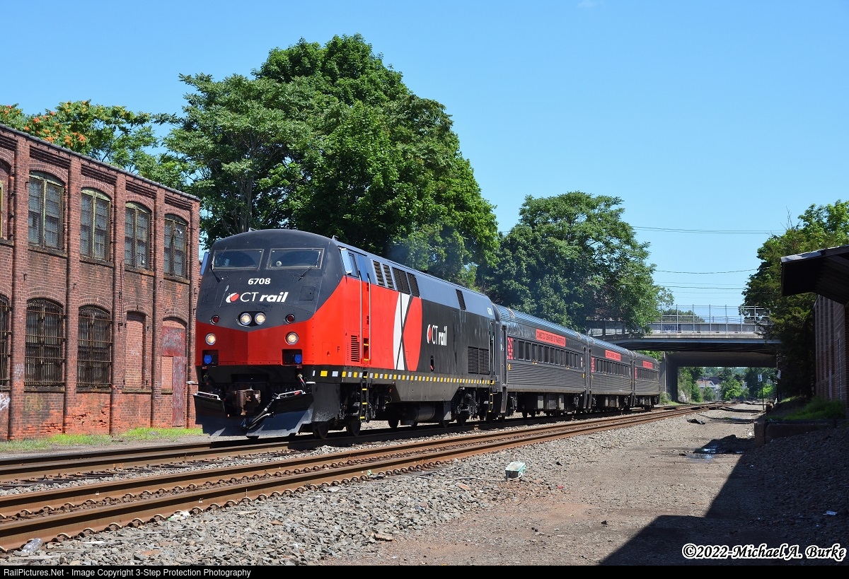 | In July of 2022, CTrail 6708 was the latest rebuilt P40BH to hit the rails. It's seen leading a late-running morning train 4403 in Meriden. Originally it was built for Amtrak as their 812, then it wore number 4800 under New Jersey Transit before being acquired by the Connecticut Department of Transportation. |