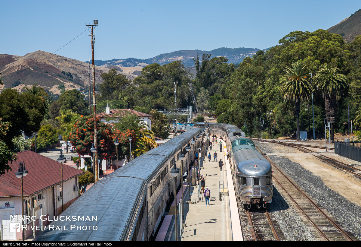 Sunny In San Luis Obispo. On the afternoon of July 25, 2020, both Amtrak Coast Starlights (Trains 11 and 14) were changing crews in San Luis Obispo, California at the same time. Train 14 (Los Angeles, CA-Seattle, WA) had a pair of additional cars that day, with former Northern Pacific Railway Budd built Pullman dome 313 (WEBX 801044) and former New York Central Railroad Budd built Pullman obs/diner "Babbling Brook" (WEBX 800007) holding the markers. The cars would be taken off the train in Oakland, California and that evening, going out on the California Zephyr the next day. More on the Webb Rail fleet at www.webbrail.com