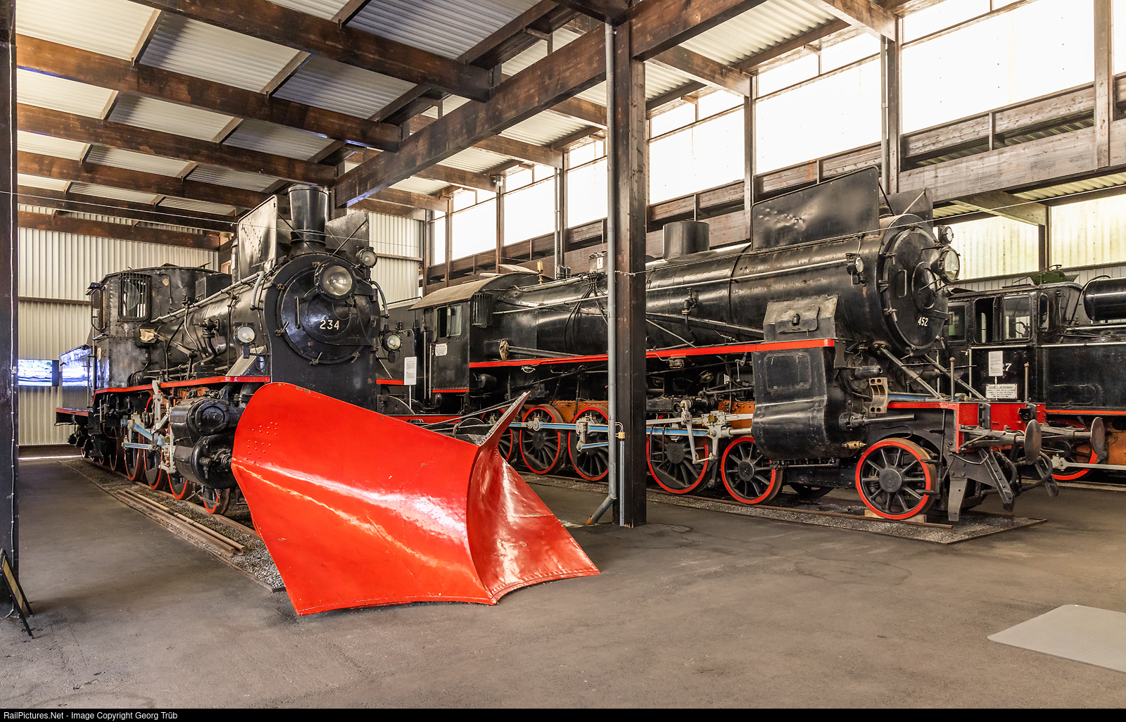 Two Norwegian steam locomotives at the railroad museum in Hamar. On the left, the 4-6-0 class 27a # 234, built at Thunes mekaniske verksted, Christiania in 1912 (construction # 55). NSB Type 27a locomotives were called "Sydbaneracers" because the first locomotives of this type were used on the southern lines in the districts of Drammen, Hamar and Kristiansand. They were light and fast locomotives for operation on lines with low axle loads, with 1600 mm driving wheel diameter and 75 km/h maximum velocity. When the expansion of the lines for which they were originally supplied took place, they were transferred to lower-value services. After World War II, the 27a ran on the Indre Østfoldbane until electrification on December 17, 1958. On the Rørosbane, the class was responsible for the 301/302 Hamar-Tynset passenger train pair until 1961, when it was replaced by the Type 26; the 373/374 Hamar-Rena passenger train pair until August 4, 1963 (replaced by railcars); and the 377/378 Hamar-Koppang passenger train pair until May 31, 1959 (replaced by railcars). Shorter trains on the Vestfoldbane were part of its duties until its electrification in December 1957. The last area of operation until 1969 was the Elverum-Kongsvinger line, on which ballast trains were to be hauled. The last 27a # 234 to be taken out of service on September 29, 1969, has been preserved and stands in the locomotive hall of the Norsk Jernbanemuseum in Hamar.