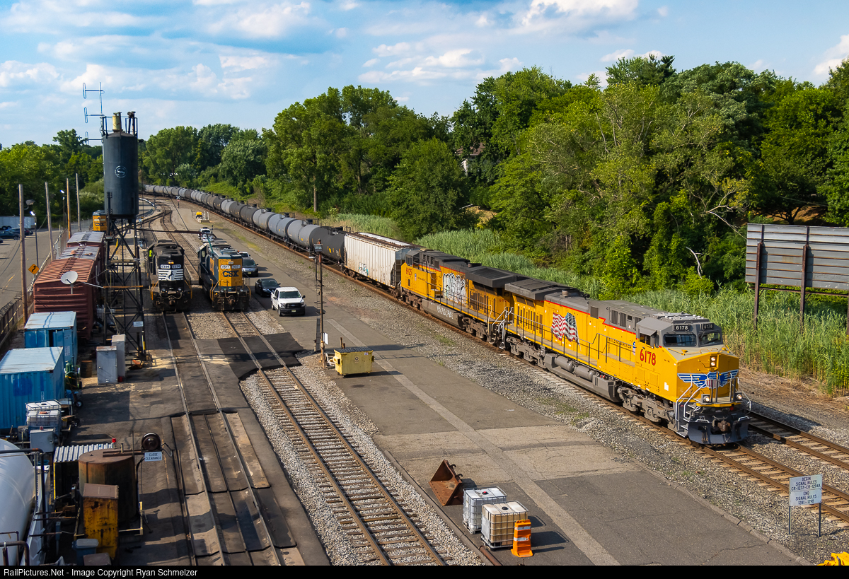 | A pair of UP GEs lead a southbound ethanol train into CP5 in Ridgefield Park. The New York Susquehanna & Western engine facility is to the right, occupied by several leased locomotives. |