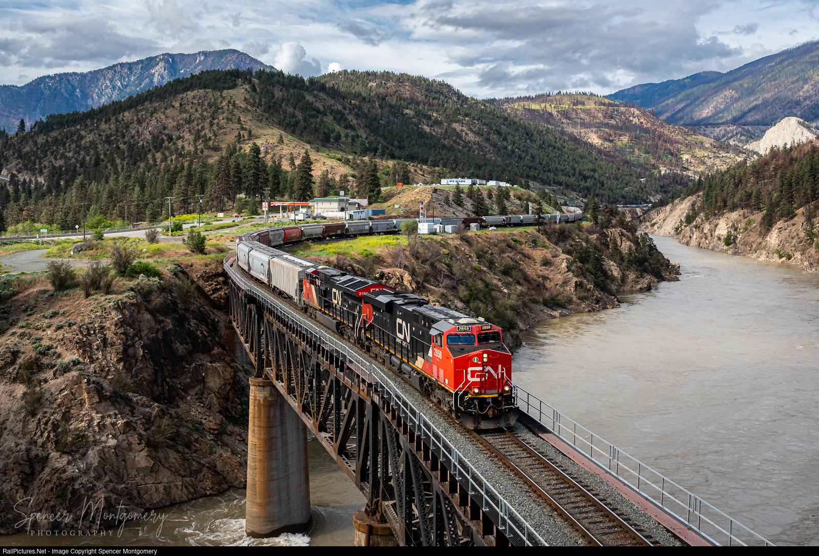 CN 2858 leads a grain train across the Lytton Bridge.