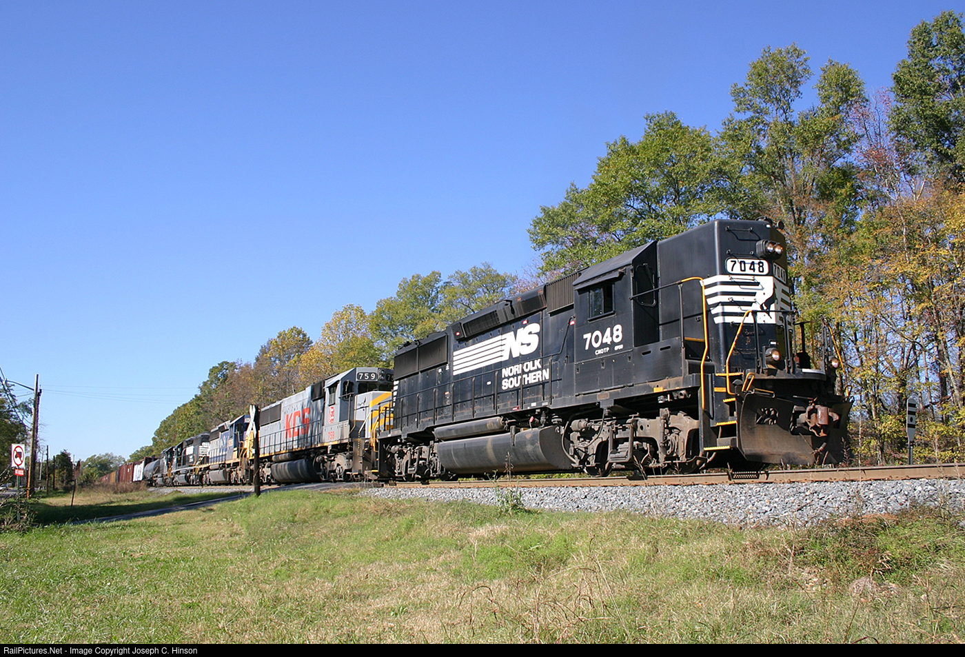 | NS 338 leaves Rock Hill, SC on a cool November day in 2004. Originally built for Southern in 1980, 7048 is now the the GP33ECO 4722 |