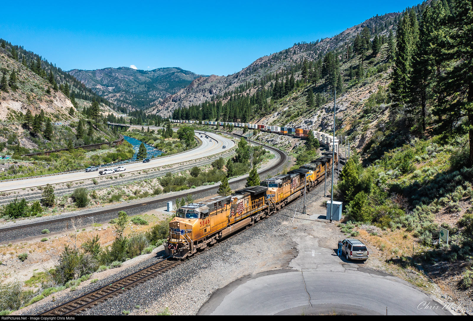 | Union Pacific stacks with AC4400CW No. 5846 leading climbs the up the Eastside of the Sierra Nevada Mountains. Climbing through the Truckee River Canyon alongside Interstate 80 and the Truckee River after leaving Reno Nevada, the train will continue the assault on the Summit at Norden on the Donner Pass Route. |