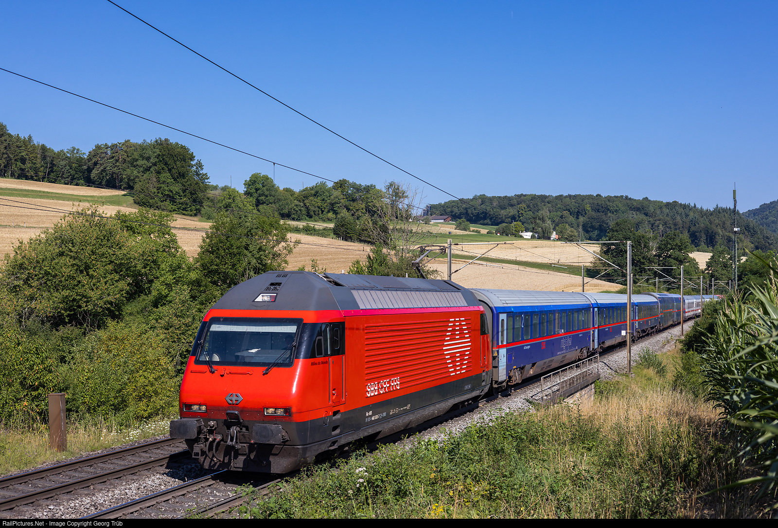 | Re 460 # 003 "Milieu du Monde" is pulling the about 100 minutes late NightJet 471 with sleeping, couchette and seat cars from Hamburg and Berlin to Zürich, on the Bözberg north ramp between Hornussen and Effingen. |