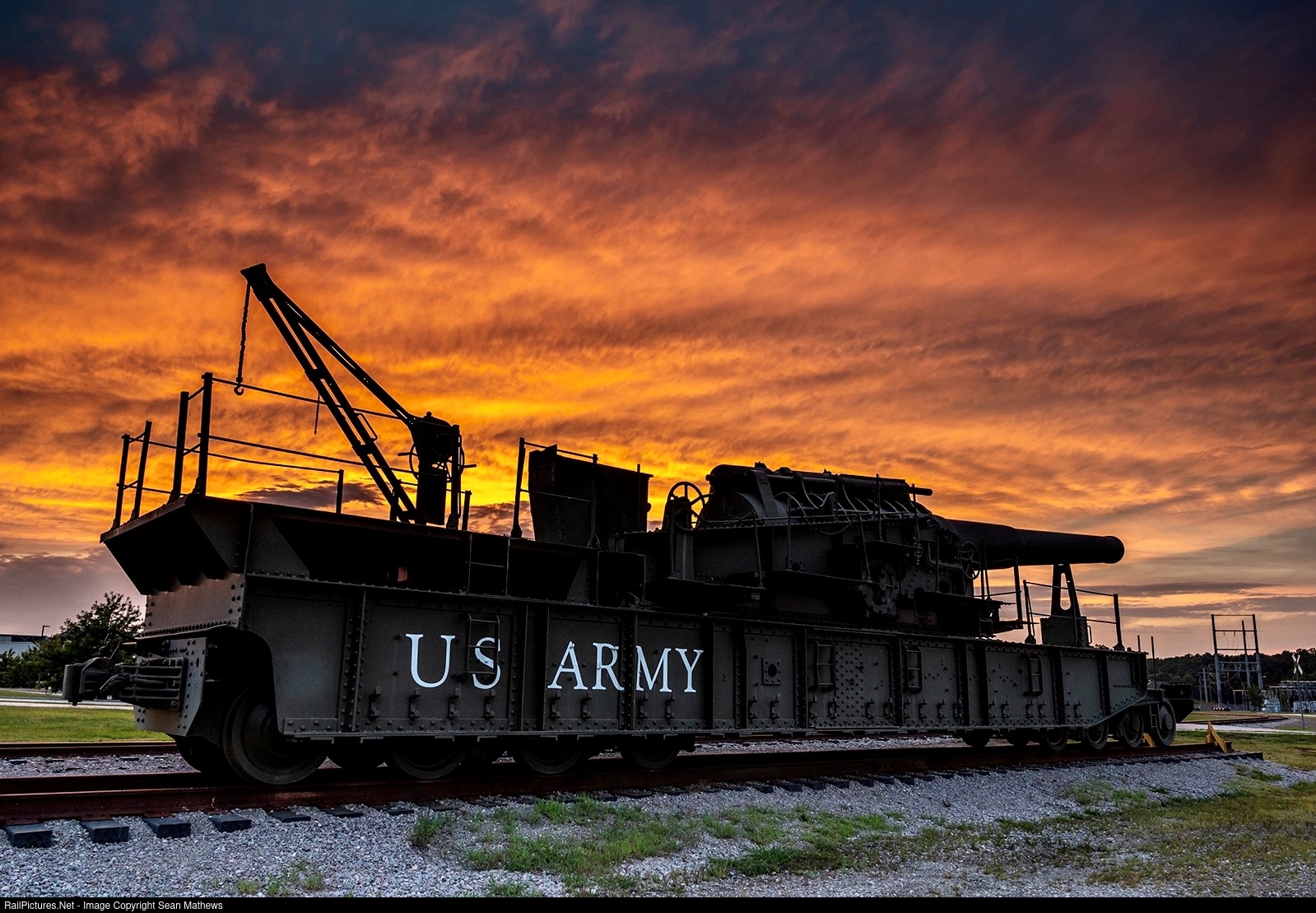It's a beautiful summer evening with fire in the sky to stop at my favorite piece of rail equipment on Fort Lee. While she might look big, a Krupp V5 German railgun nearly twice the size sits in a museum on base. The placard at the base of the guns says: Built at Watervliet aresenal in NY about 1900. A railway mount (model of 1918) was built by the Marion Steam Shovel co., Marion, Ohio 1920. It's the oldest remaining 12" gun mount on railway and is still in firing condition. It was used as a primary coast defense weapon through the 1920s. In 1942 the Navy acquired it from Aberdeen proving ground, MD. It was then used for the ballistic test of bombs and various proof of test exercises.