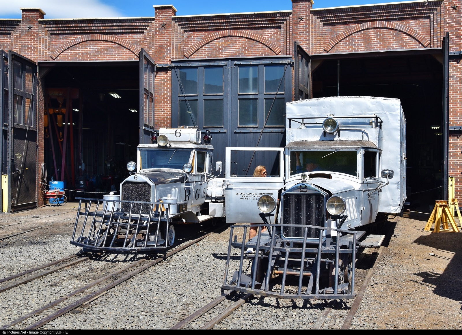 Two of the Colorado Railroad Museum Galloping Geese (Rio Grande Southern 2 and 6) sit at the roundhouse of the facility in Golden, Colorado.