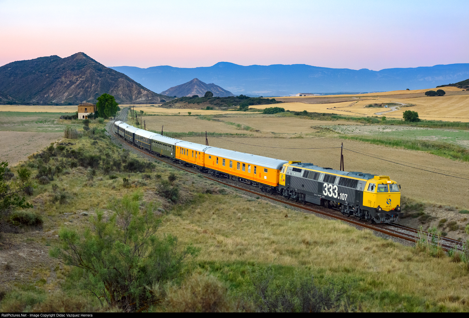 | Historic train with GM 333.107 from Canfranc international station to Zaragoza, going last time by the original tracks of the line with the last light of day. |