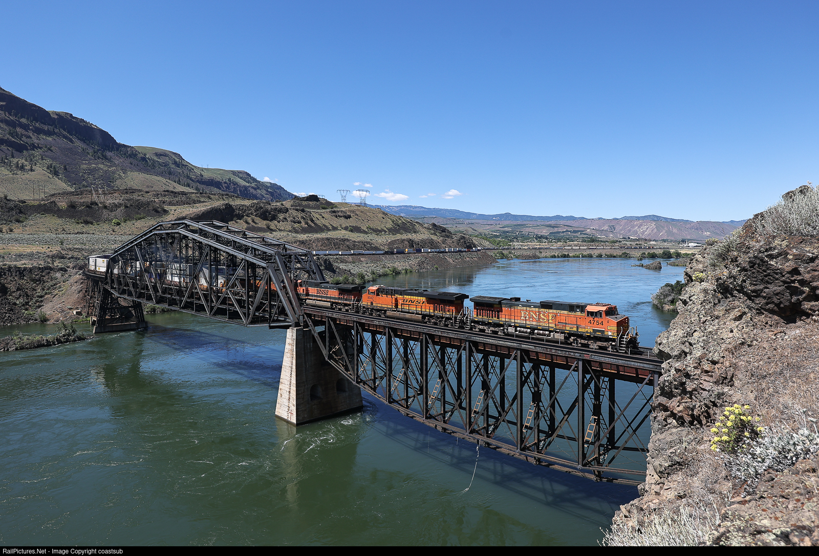 | After a quick crew change in Wenatchee, a Seattle to Chicago Z train crosses the Yakima River at Rock Island, Washington. The Great Northern Railway chose this location because it was the narrowest river crossing in the entire state of Washington. |
