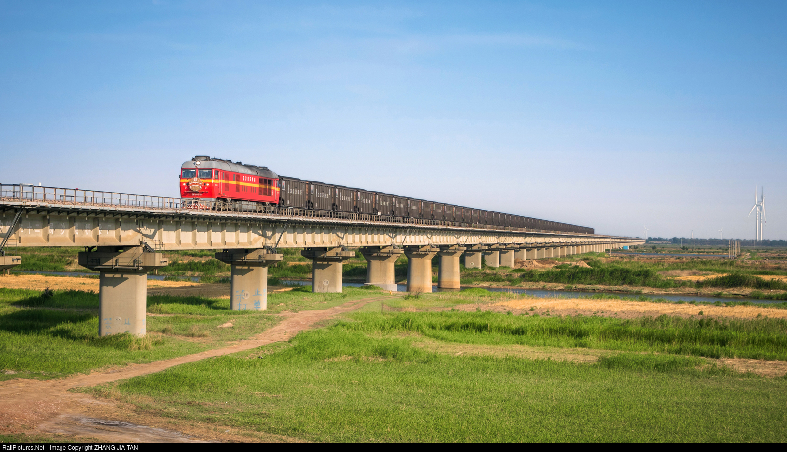 Tianjin local railway “Workers Pioneer” locomotive running at trestle
