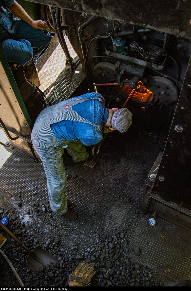Fireman George Barreto rakes forward a heal on the fire during hostling operations on a very hot 4th of July afternoon. The crew will soon take a sold out train to the end of the line for fireworks.