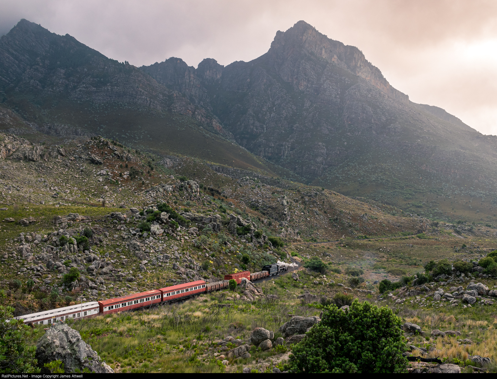 | Ceres Rail Company's class 19D - No.3322 - and mixed consist are dwarfed by the two Mountainous peaks that form part of Michell's Pass, between Wolseley and Ceres.