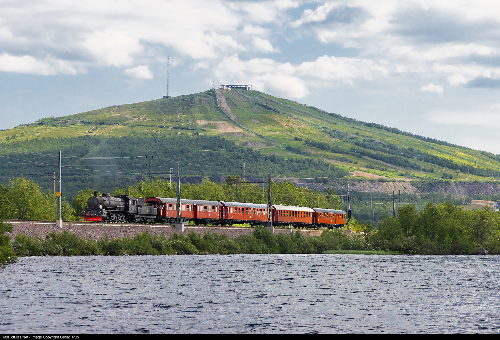On the occasion of the 120th anniversary of the Kiruna (Sweden) to Narvik (Norway) ore railroad, which was opened in 1902, the Swedish Railway Museum in Gävle, together with the mining company LKAB, organized a multi-day event in Kiruna and on the Swedish part of the ore railroad line. On 3 days, the 0-10-0 steam locomotive R # 976, built in 1909, pulled a passenger train several times around Lake Luossajärvi and through the mining company's railroad facilities. The about 20 minutes ride was free and open to everyone without formalities. The train left Kiruna station short time ago and reached the shore of the Lake. In the background is the 724 meter high Luossavaara mountain with skilifts.