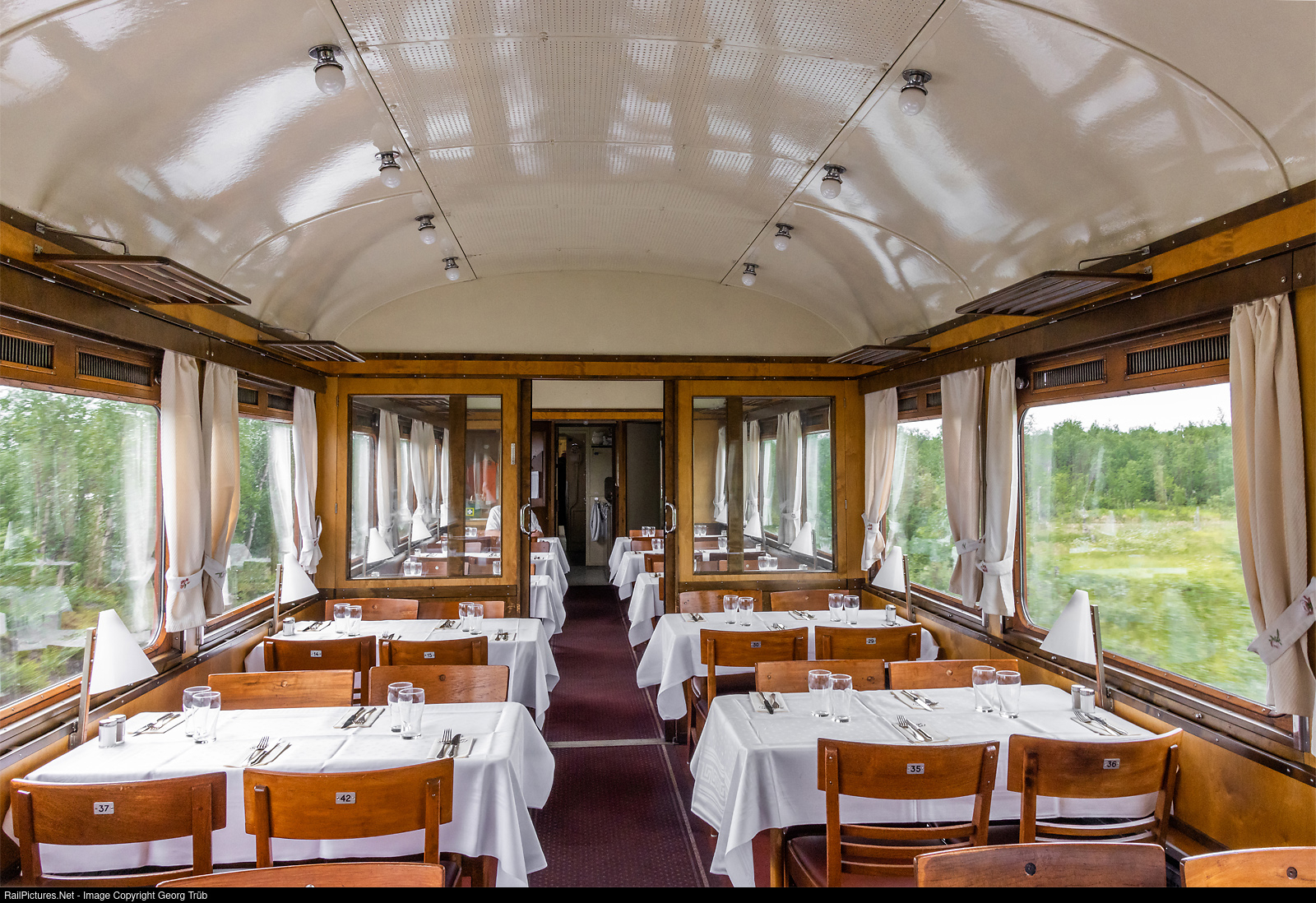 48 seats salon in the restaurant car # 3749 of the Swedish Railway Museum of Gävle, in the extra train from Kiruna to Abisko Oestra and back, pulled by locomotive Da # 888. Restaurant car Ro3b # 3749 "Rudolf Cronstedt" was built by Kalmar Verkstad in 1946 as a welded steel wagon. The car was built in a series of three and it was SJ's first fully electric restaurant car. The carriage had a kitchen and two dining rooms with a total of 48 seats. The carriage was also beautifully decorated with intarsia artwork by Ewald Dahlskog. They are still present in carriage 3749, depicting Gothenburg and Malmö. Ro3b # 3749 has been completely refurbished and has been part of the vintage train since the mid-2000s. In the carriage, the food is prepared on board and served with finesse by means of a maître and staff, of course on real china on white tablecloths. Rudolf Cronstedt (1826-1906) was a count, engineer and civil servant, and between 1887 and 1897 he was SJ's director general. In the 1980s, SJ named all its special and conference carriages after older general directors, and carriage 3749, which was then part of this carriage fleet, was named "Cronstedt's carriage".