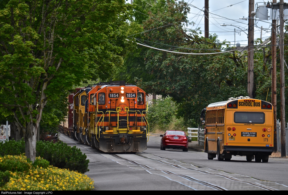 | Ever so often PNWR 1854 gets taken off the Rock Train for service. When this happens the unit needs to be dropped back off at Woodburn, OR to reunite with train. With a little divine intervention, the unit may get to lead the train delivering it back to Woodburn where it always sits 2nd in consist. This happened on July 6th and getting to see a 67 year old ex SP 4433 lead a loaded lumber/log train on street trackage was a sight to see! |