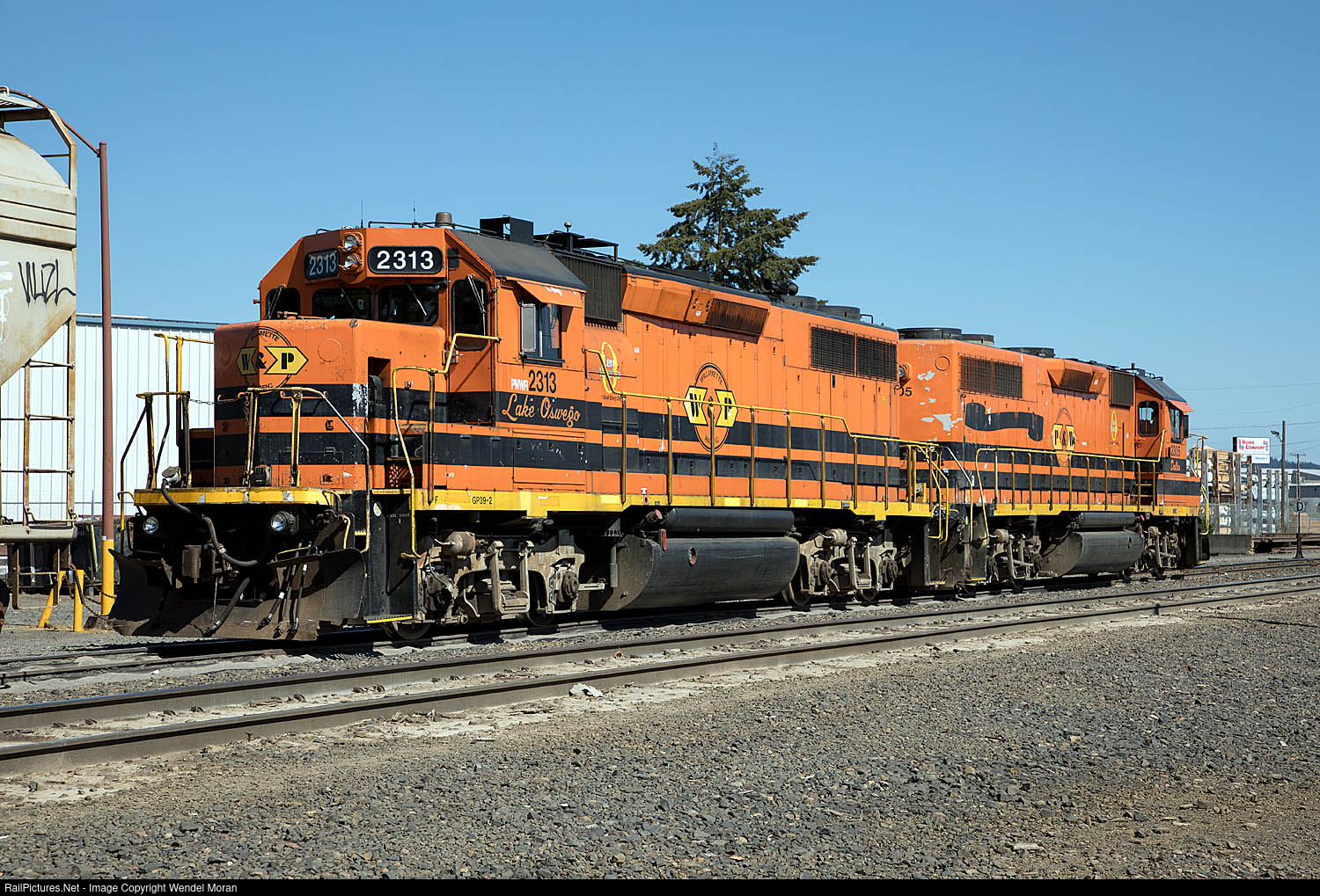 | Two of Portland & Western's ex-ATSF GP39-2s spend a Sunday afternoon laying over at the former Oregon Electric terminal in Eugene. The PNWR 2313 is somewhat notable, as it still carries its original Willamette & Pacific heralds. |