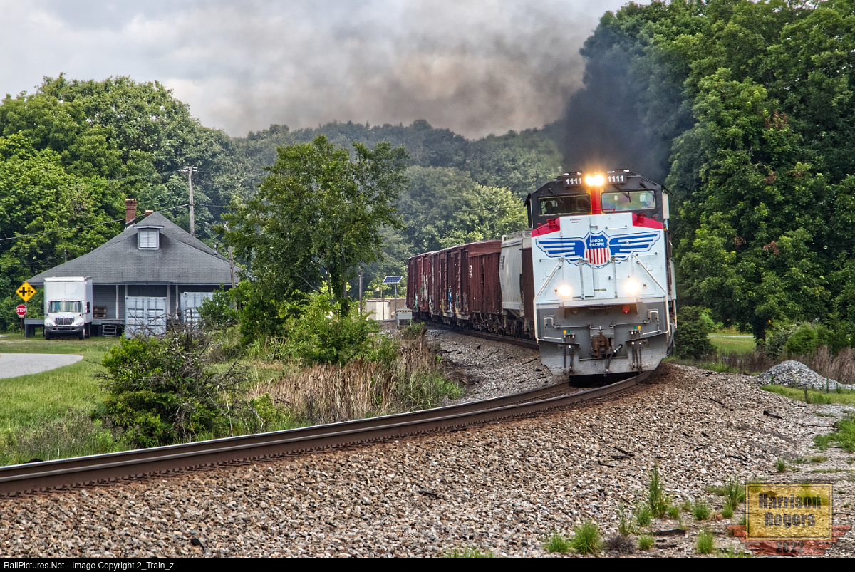 | UP 1111 puffs out some smoke as it leads train 369 through the S curve at Jackson, Georgia on Independence day 2022. |
