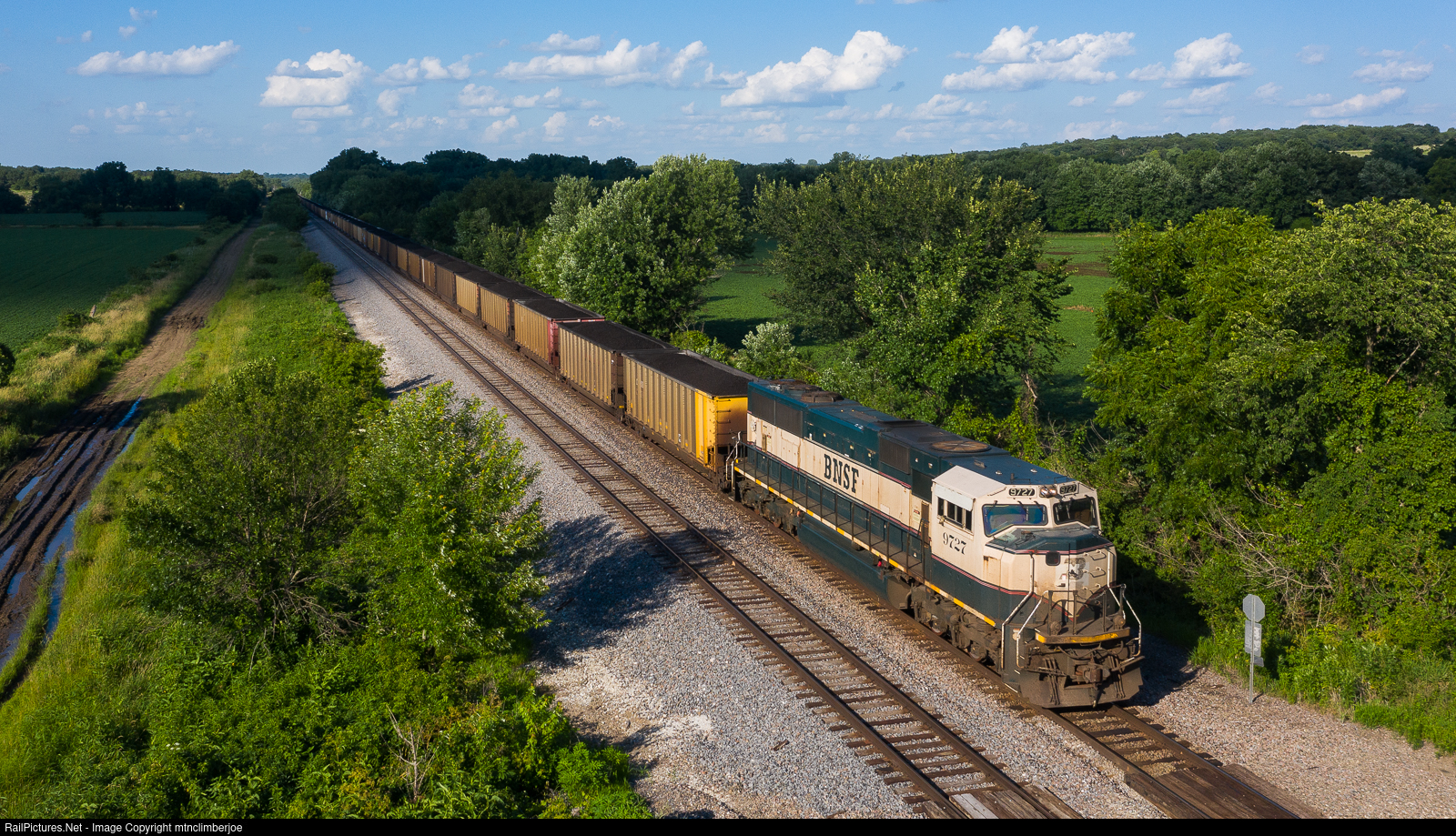 | BNSF Executive SD70MAC 9727 brings up the rear of loaded BNSF coal train C BAMOPP0 18A heading west through Halpin, Iowa, dodging cloud shadows as it rolls along farm fields and begins to climb the grade into Albia. |