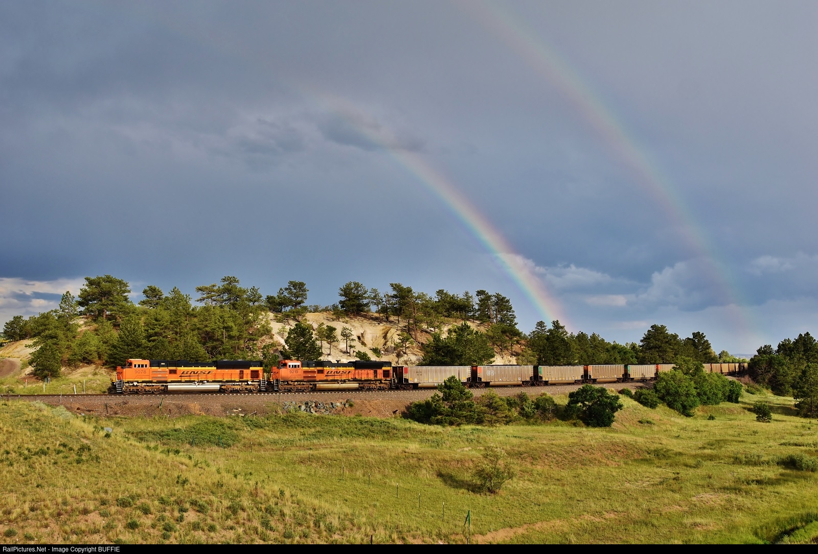 A pair of BNSF ACe's muscle a coal train through Monument, Colorado, passing a pair of rainbows that popped up after thunderstorms moved through the area.