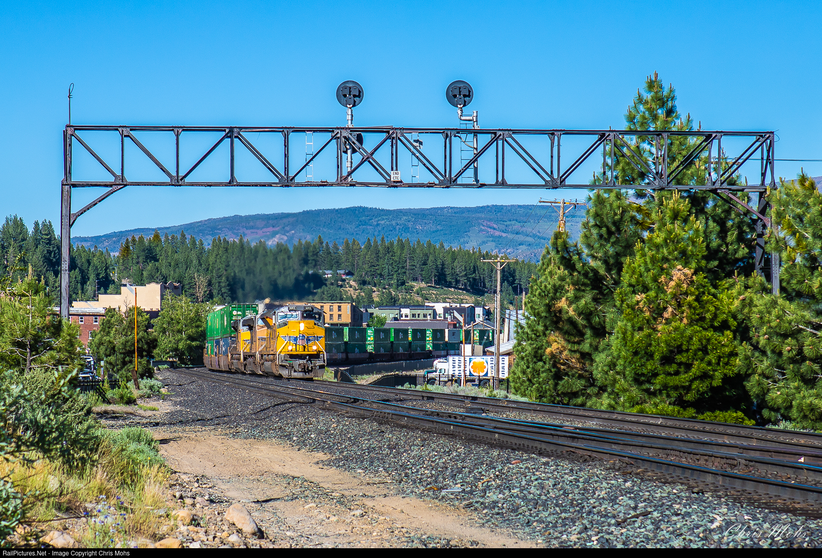 About to pass under the Southern Pacific Signal Bridge in Truckee, Union Pacific SD70AH No. 3093 powers up for the the final climb up the eastern slope of The Sierra Nevada Mountains to the top of Donner Pass at Norden.