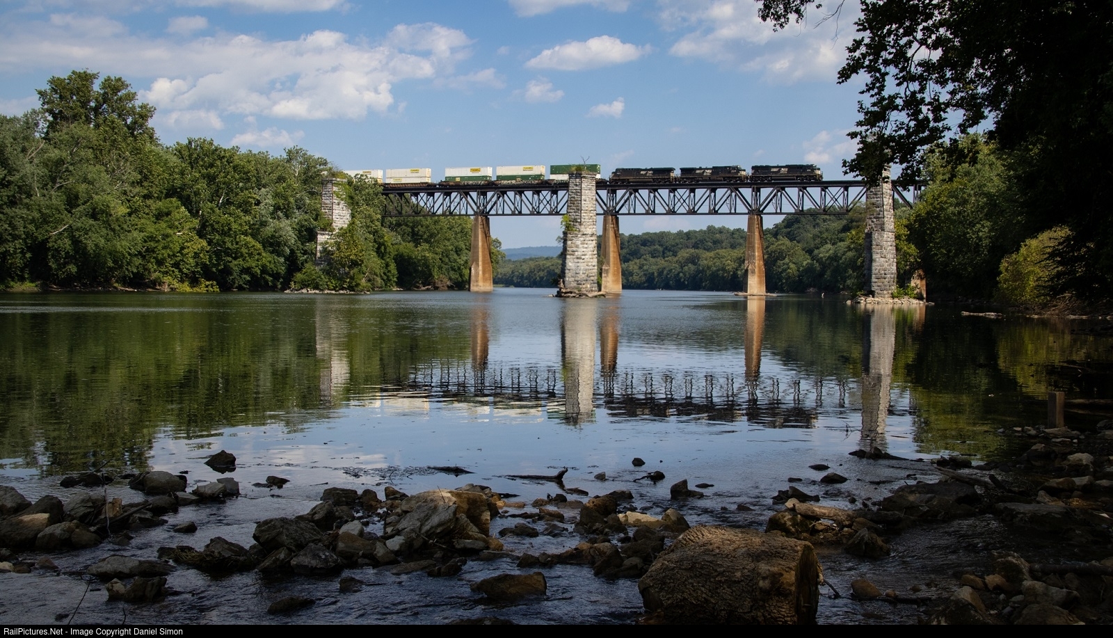 On a beautiful July afternoon, Norfolk Southern train 201 (Rossville, TN-Rutherford, PA intermodal/manifest) crosses the Potomac River by way of the Potomac River Trestle from West Virginia, into Maryland southbound on the NS Hagerstown District.