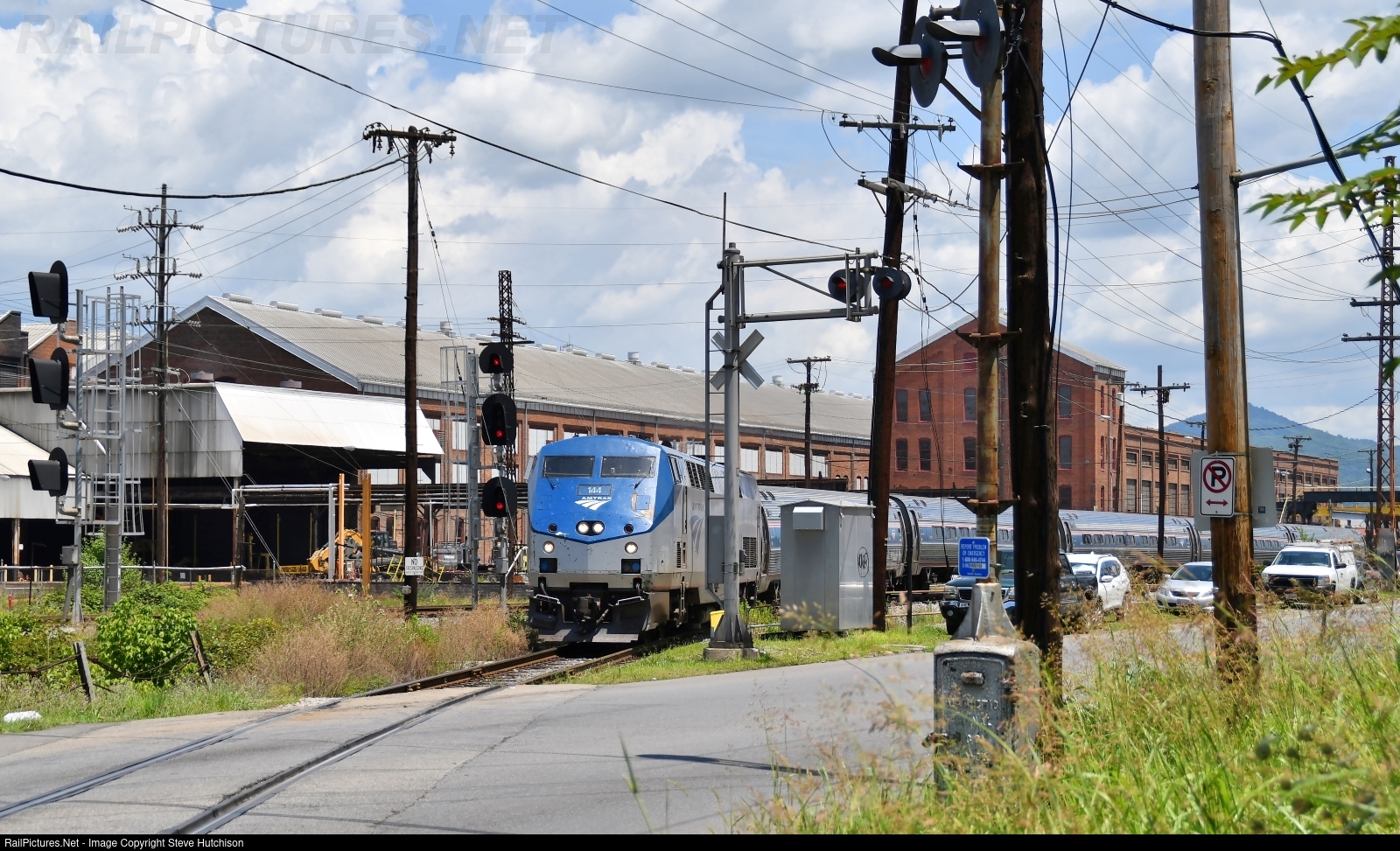 | Amtrak's newest Northeast Regional train between Lynchburg VA and Roanoke VA, is about to cross Campbell Ave on the southeast leg of the wye and head to the Amtrak servicing facility on Williamson Rd. The deserted former N&W, Norfolk Southern East End Shops are in the background. |