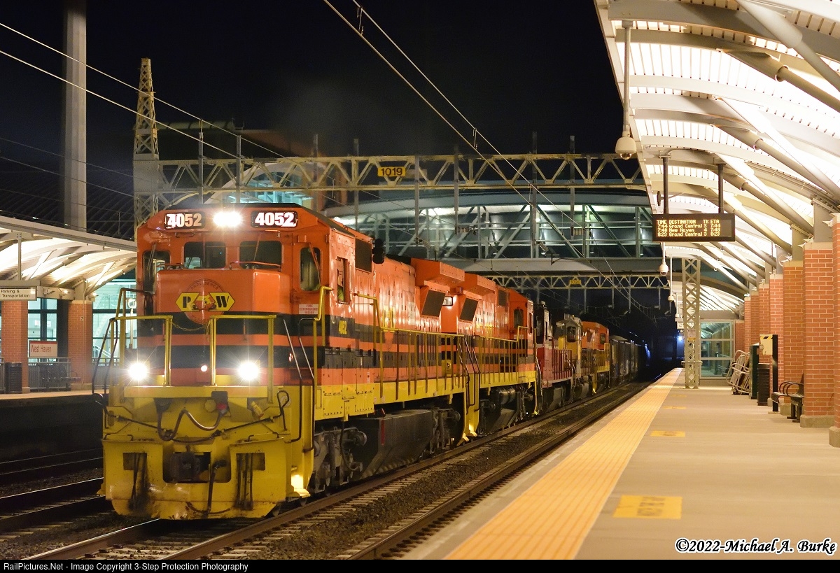 On a humid summer night in West Haven and still feeling like it's in the 90s, a mixed bag of five locomotives is in charge of Providence & Worcester train CHFP. Tonight's freight has 99 loads of stone for Fresh Pond Yard in Queens, NY, which includes 31 ballast hoppers for the Long Island Railroad. The locomotive consist is C40-8 4052, C40-8 4051, B40-8 4004, Connecticut Southern SD40-2 3399, and C40-8 4050.