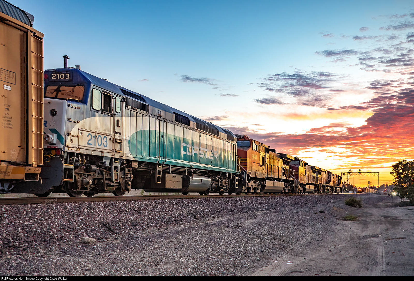 BNSF train H-BARSDG1-15A, a High Priority Merchandise freight heading from Barstow to San Diego; has just gotten a clear signal at Atwood, and is now continuing its journey an amazing 99 hours 17 minutes behind schedule, and possibly a little later after sitting here at Atwood for at least another hour awaiting permission to enter Metrolink's Olive Sub. (These searchlight signals will be replaced very soon – their less impressive replacements are already in place but covered for now.). This train is not very long (47 cars into Porphyry, but it set out 22 to 30 cars there) and is powered by a quartet of Dash 9-44CWs, the first three of which (799, 677 and 775) still wear the iconic ATSF/BNSF "Superfleet" red and silver paint scheme, with the fourth engine (5041) painted in BNSF's "Heritage II" black and orange (with yellow initials on the hood) scheme. Behind the power is Coaster F40PH-2C 2103, traveling dead-in-train back to San Diego, reportedly to be delivered to the Pacific Southwest Railway Museum. This train finally got clearance to move onto Metrolink's Olive Sub (and, from there, Metrolink's Orange Sub and then San Diego Northern's San Diego Sub) at 8:15 pm (20:15) and the crew was literally able to head into the sunset. (Placentia, California – July 20, 2022)