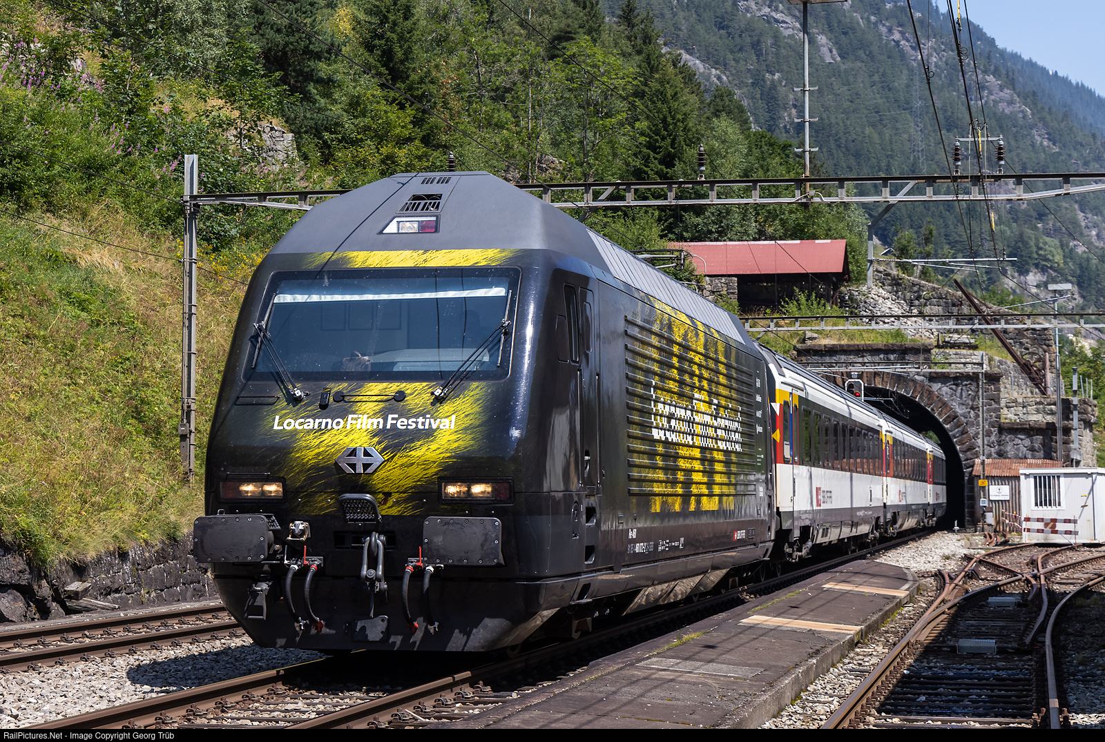 | Re 460 # 072 of the SBB in the publicity paint scheme for the "Locarno Film Festival" is running through Wassen with the empty push-pull train (standard cars type IV) 32230 from Göschenen to Arth Goldau. The train made the inforcement passenger extra 31217 from Arth Goldau to Göschenen before for transporting scouts on the way to the large "Mowa" camp in Ulrichen/Valais. |