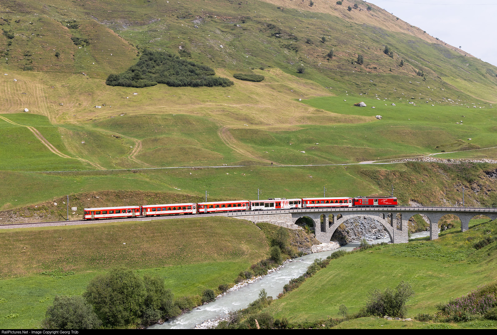 Cogwheel railcar Deh 4/4 II # 94 of the Matterhorn-Gotthard-Bahn (MGBahn), former Furka-Oberalp-Bahn (FO), built in 1979, is shoving the push-pull train R 541 from Andermatt to Visp, between Hospental and Realp, crossing the Richleren viaduct. The train is reinforced with a "module" of a B and a ABt cab car because high passenger frequencies.