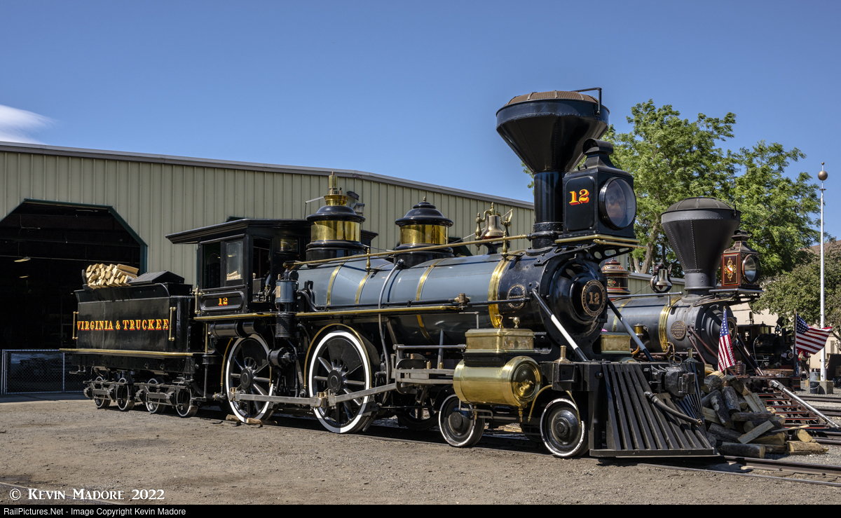 V&T Survivor: #12 "Genoa". Named for a small town in Western Nevada, V&T Locomotive #12 is another one of the V&T survivors that hasn't seen daylight in a long time. Sent to the "Great Western Steam-Up" from the California State Railroad Museum as part of a 2-year loan, this locomotive is stunning in the mid-summer sun in Nevada. This classic 4-4-0 American Standard was built in 1873 by the Baldwin Locomotive Works for the Virginia & Truckee Railway, and for the next 30 years, she hauled passenger, mixed and occasionally freight trains over the entire length of the shortline between Reno, Carson City and Virginia City. This locomotive was a favorite with railroad crews and was typically maintained in the sort of "spit and polish" condition you see here.