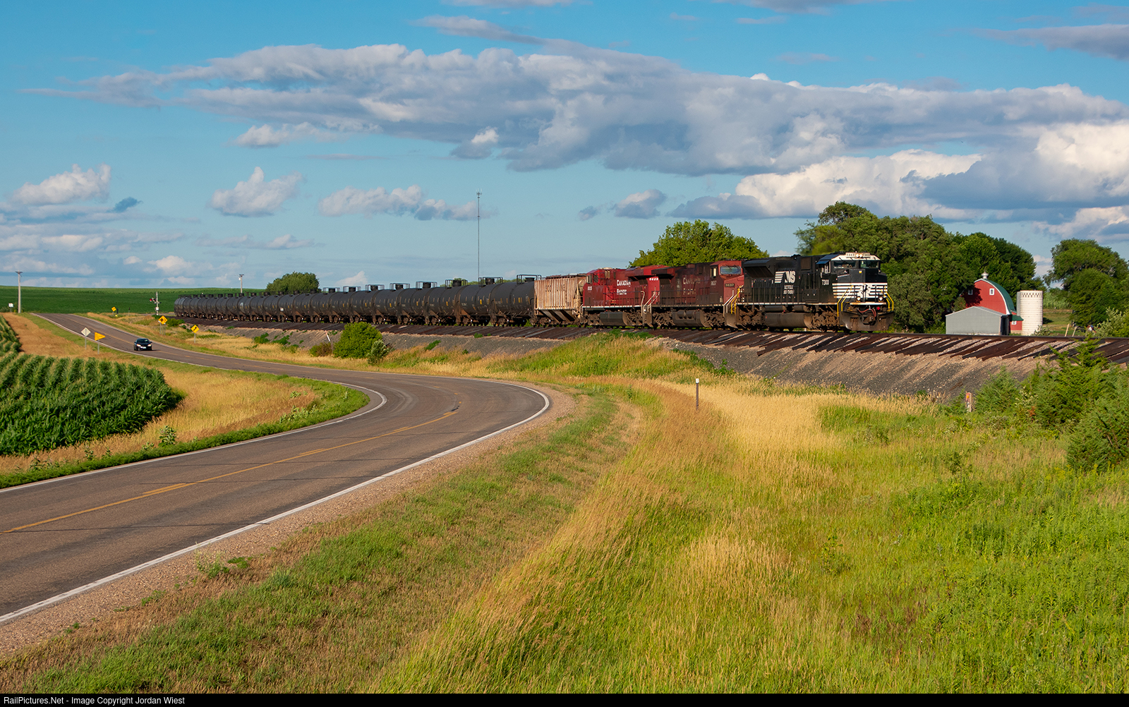 | My 2nd SD70ACU leader on this day was Norfolk Southern's class unit of this type on a westbound oil train. Here the train nears Eden Valley, not going too fast due to slow orders, which made for an easier chase. |