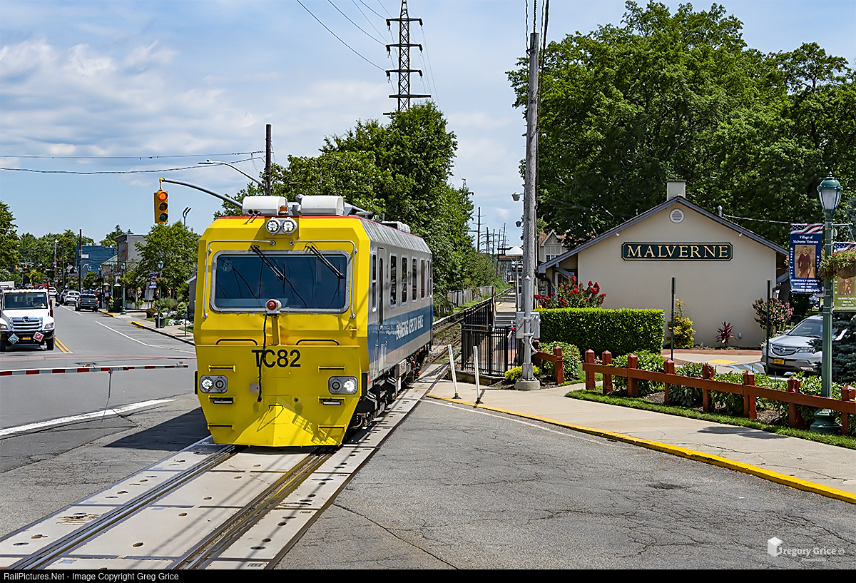 On the morning of July 27th, 2022, Long Island Rail Road's "TC-82" Track Geometry Vehicle heads west past Malverne Station towards Valley Stream on the West Hempstead Branch. The TC-82 is a Track Geometry Vehicle built by Plasser American Corporation for track inspections throughout the Long Island Rail Road system.