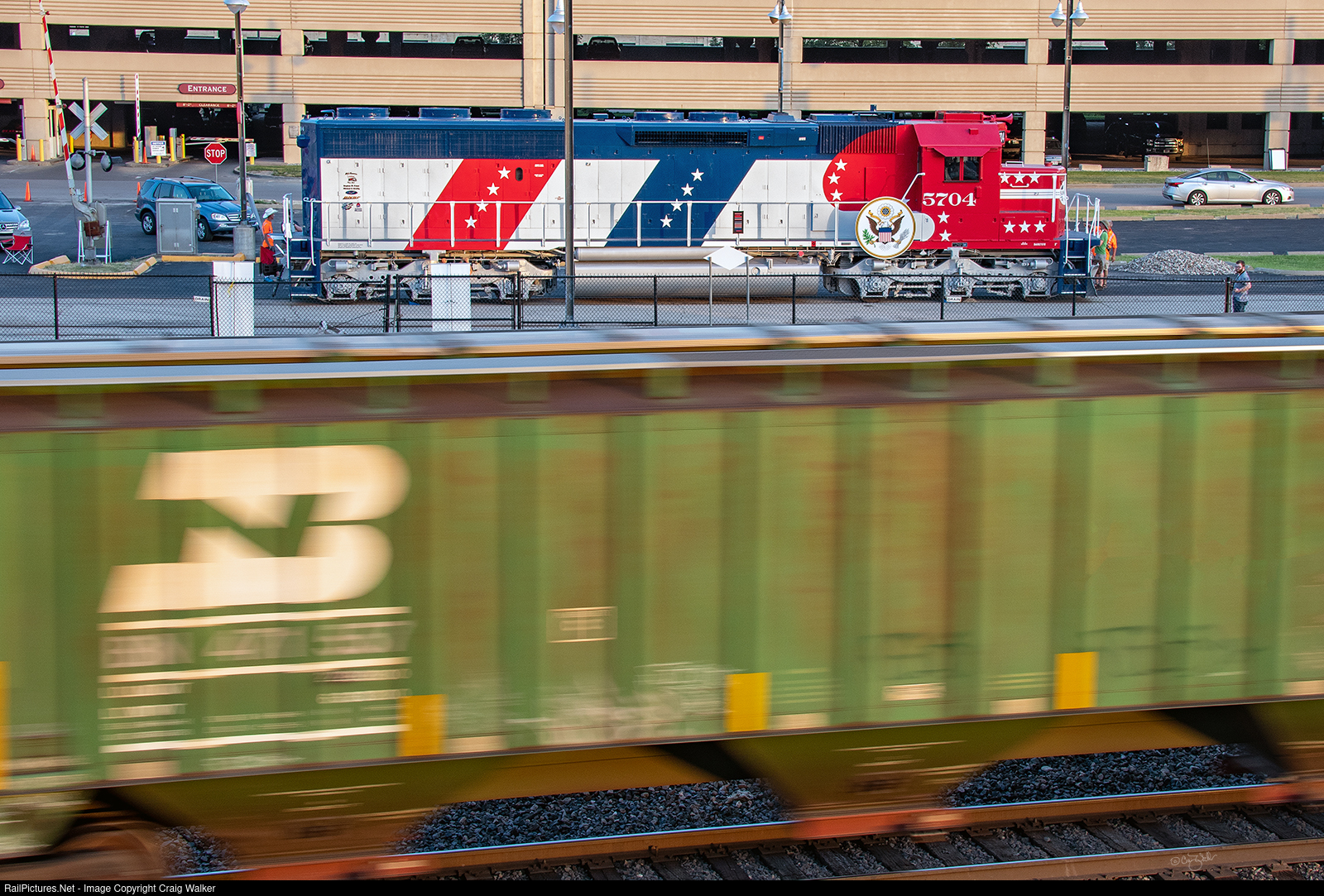 As BNSF Railway High Priority Merchandise train H-BARPAS7-18 passes through Kansas City on a long detour as it heads from Barstow CA to Pasco WA, we see Atchison Topeka & Santa Fe SD45-2 5704 on KC Union Statin’s Track 27. This 1973 EMD product was recently saved from the scrapper’s torch and restored to its attractive 1976 Bicentennial paint scheme. IN a few more days, this locomotive will be placed in BNSF Priority UPS-LTL Intermodal train Z-LPKLAC6-22A to be ferried dead-in-train to Los Angeles, California, where it will be stored awaiting a transfer to the Southern California Railroad Museum in Perris once the rail connection is restored. (Kansas City, Missouri – June 18, 2022)