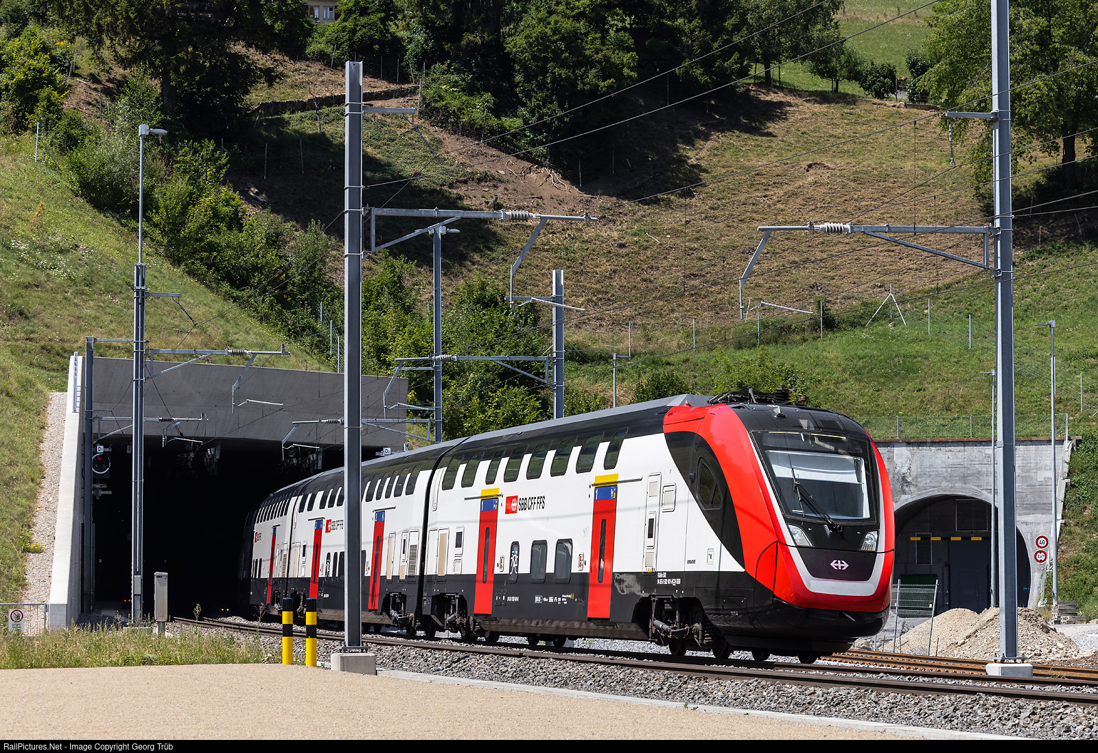 | Bombardier, now Alstom, intercity doubledeck train RABe 502 # 401 of the SBB (short IR100 version) is leaving the new Bözberg tunnel (opened in november 2020) in Schinznach Dorf, running as IR 1973 of the line IR 36 from Basel to Zürich. On the right is the portal of the old Bözberg tunnel, now rebuilt to a rescue and service tunnel with 5 connections to the new tunnel. |
