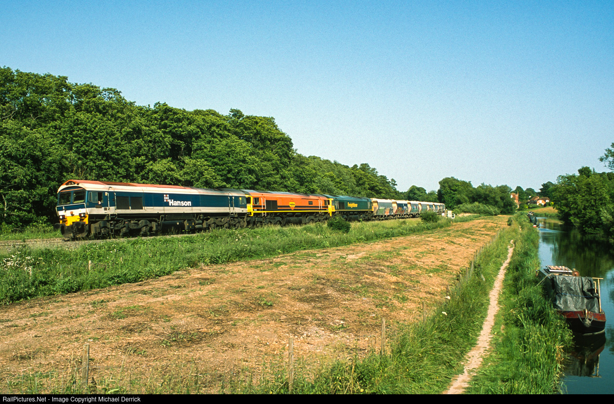 | Quite a surprising consist as this empty rock train rounded the curve in Kintbury. A trio of Class 66s is something I had not previously seen in my previous UK fanning. Only the lead locomotive is under power; the trailing two are simply being positioned back to the mines. The lead locomotive is painted for customer Hanson Aggregates. |