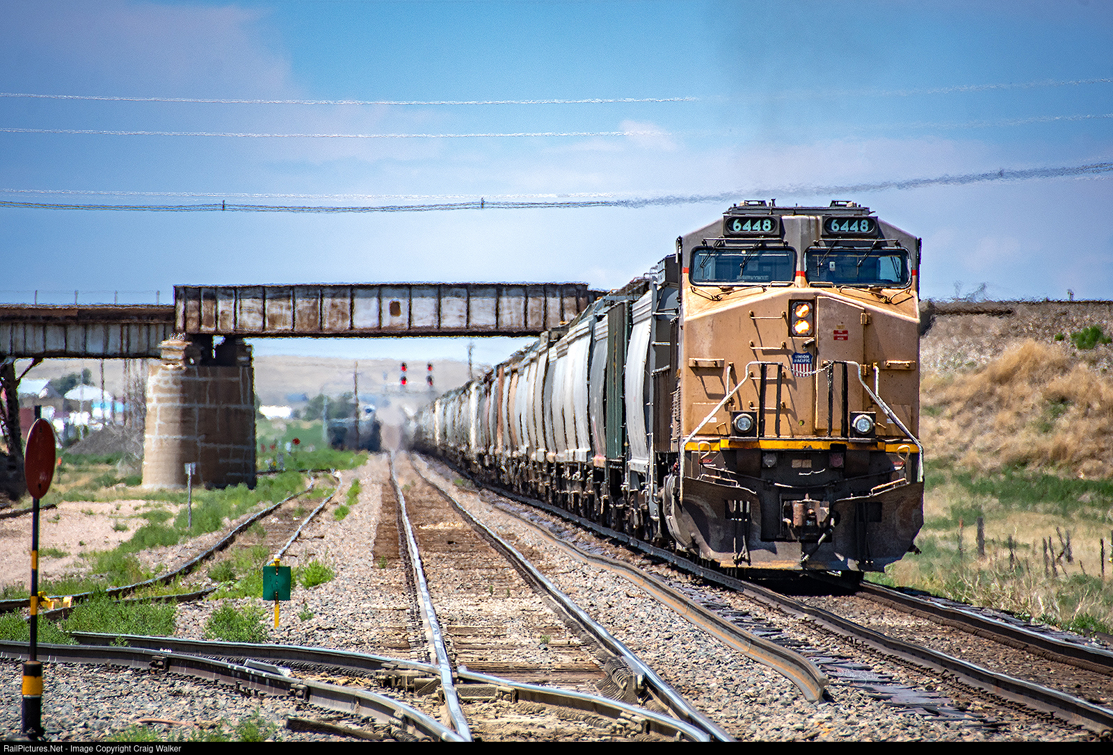 Heading west on Union Pacific’s Sidney Sub is UP train GSEXKE, a Grain Shuttle heading from Elm Creek NE to Keyes CA with 215 loads (!), weighing 30,532 tons (!!) and stretching 13,020 feet (2.46 miles!!!). This train was powered by UP SD70ACe 8567 and ES44AC 8080 up front, UP AC4400CWs 6421 and 6624, plus SD70ACe 8769 as the Distributed Power Units in the middle, and a grungy UP AC4400CW 6448 as the rear DPU. This monster train is seen passing under a bridge on BNSF Railway’s Angora Sub (ex-Burlington Northern, originally Chicago Burlington & Quincy), the line connecting the coal lines around Alliance with Denver. (Sidney, Nebraska – July 15, 2022)