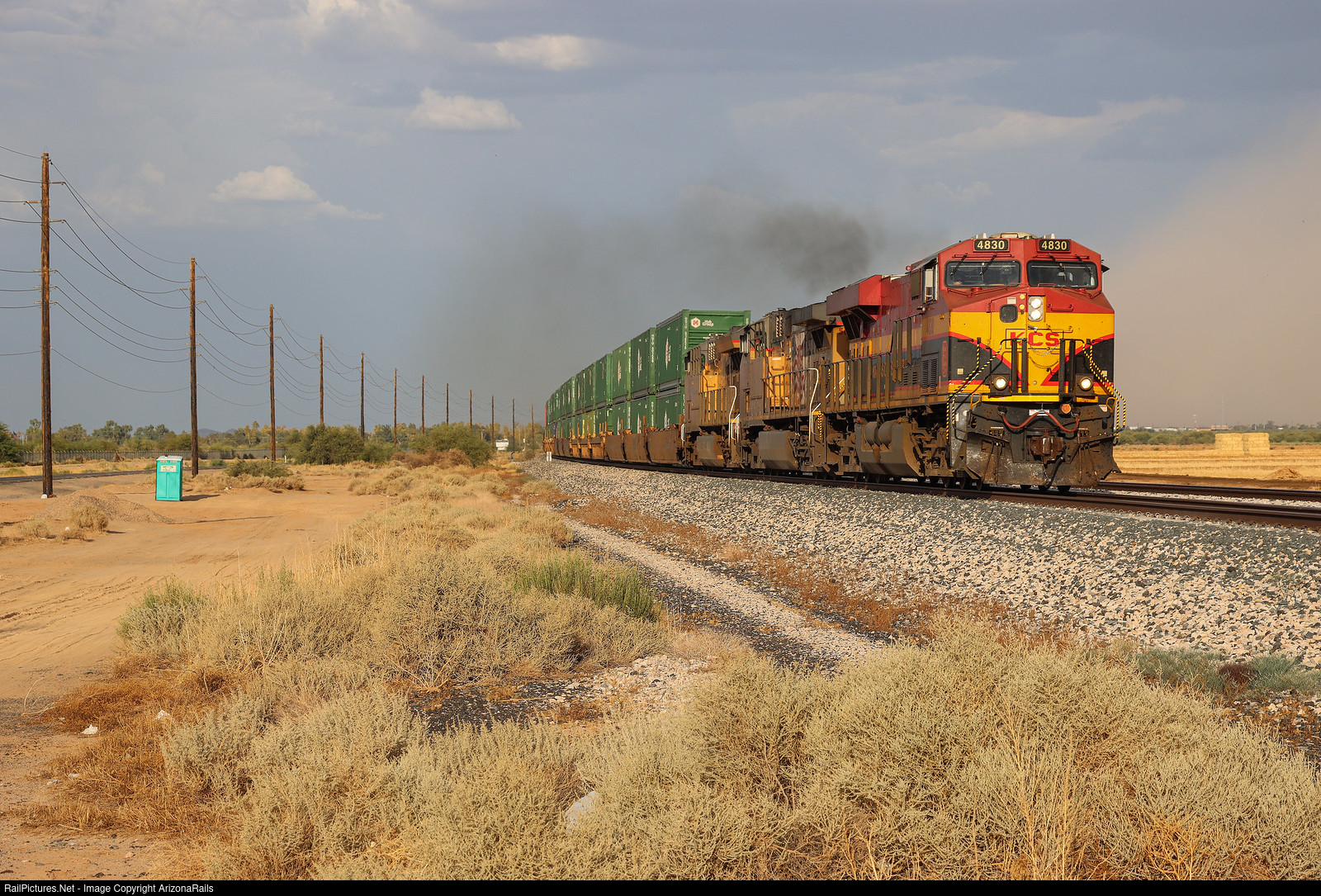 | Arizona's monsoon season is in full swing as a severe thunderstorm and dust storm collide together into one huge storm. Escaping the storm is this KCS Southern Belle, as it leads the daily Atlanta, GA to Los Angeles, CA Z train west away from the worst of what's yet to come through here. |