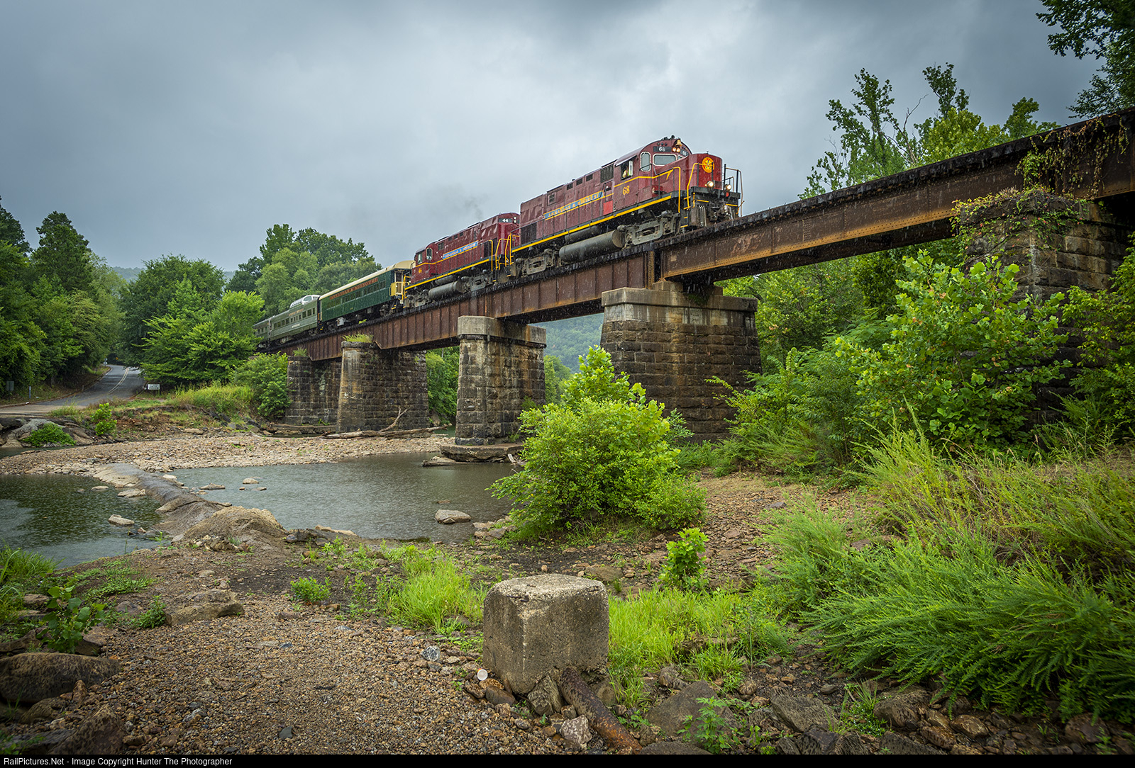Rain has started to fall near Mountainburg, AR as the northbound midday Van Buren to Winslow excursion train on the Arkansas & Missouri Railroad heads across a 477-foot-long bridge over Frog Bayou on July 30, 2022.