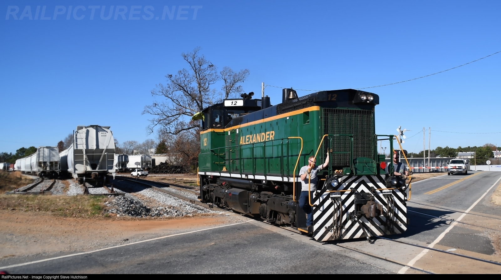 Alexander RR #12 crosses Meacham Road to pickup more freight cars from the interchange with Norfolk Southern. #12 was former Southern Pacific 2659 and ex Weyerhauser 308.
