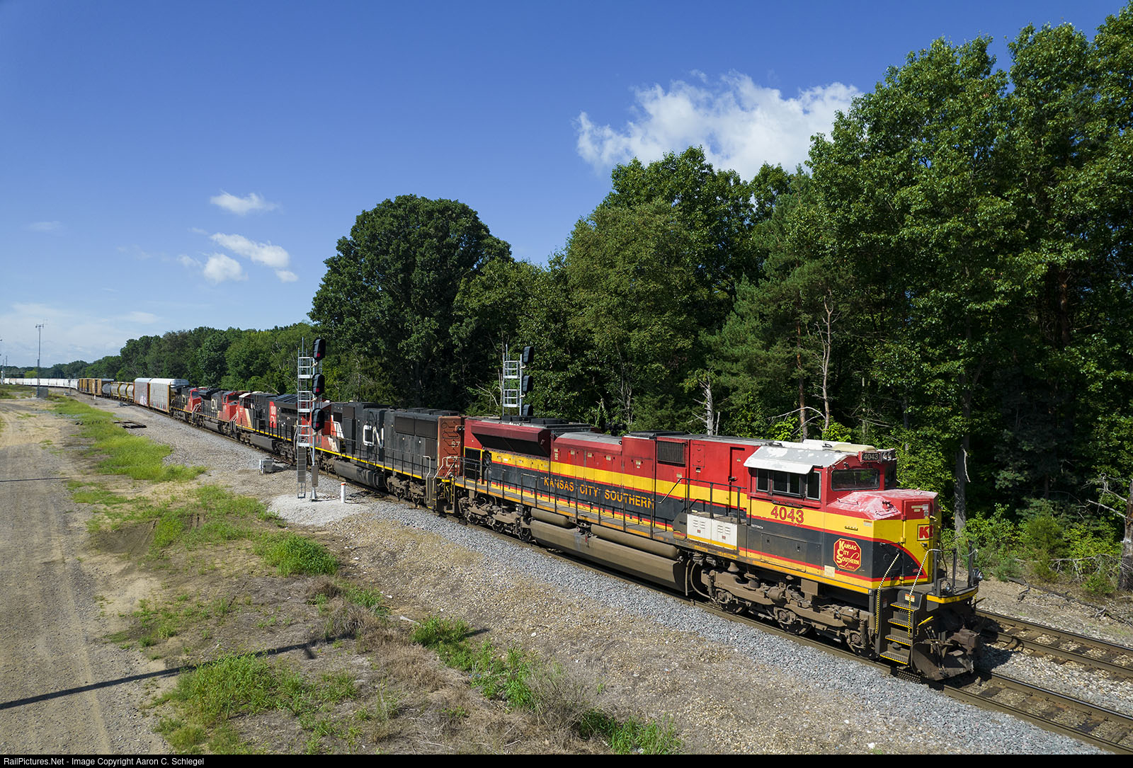 | Paint looking a little rough on the KCS ACe. KCS 4043 heads East pulling out of Battle Creek Yard. CN McAllisters last signal project had the West Bound Absolute Signal Masts moved a few hundred yards to the West. This shot shows the new location. |