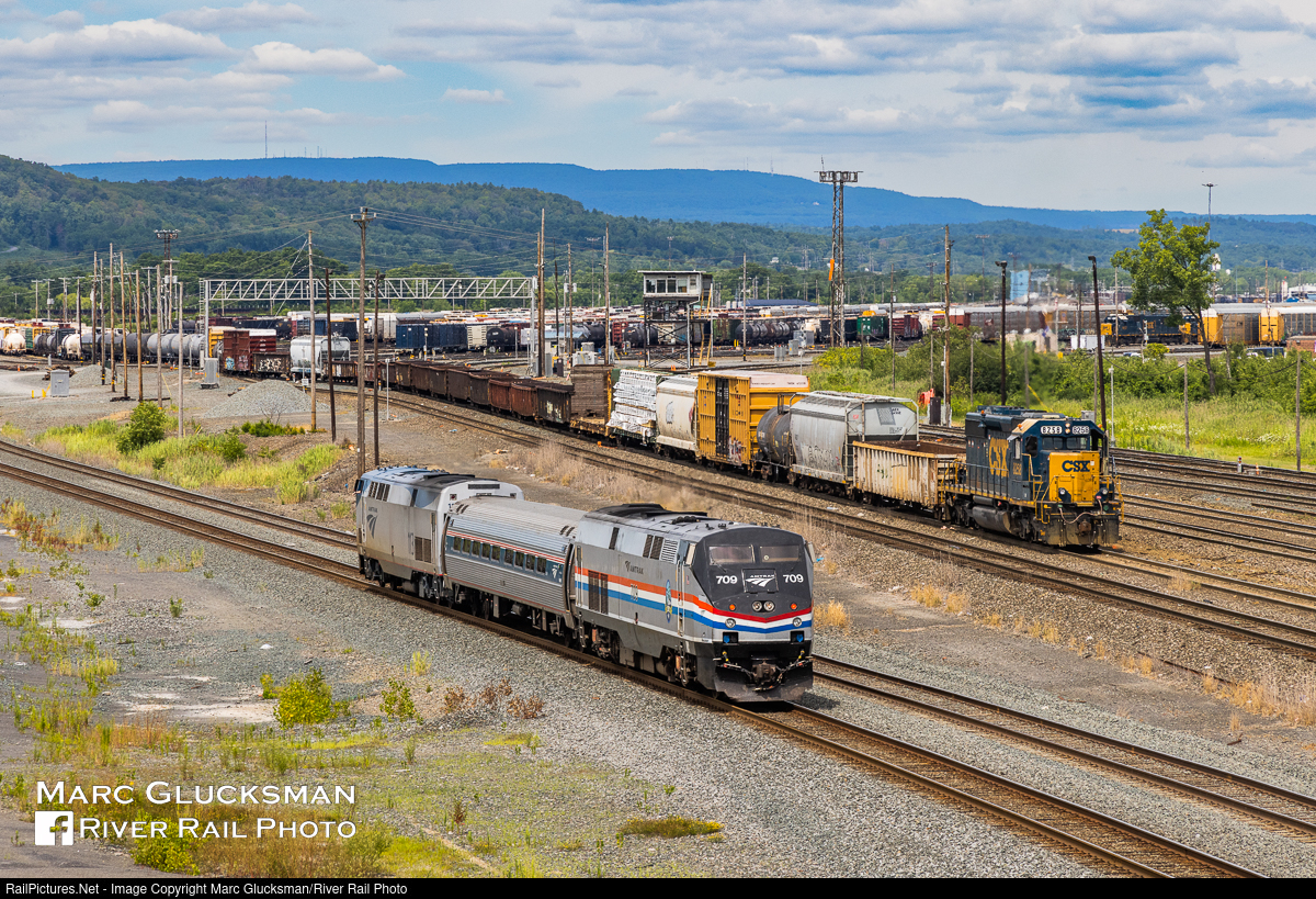 CSXT 8258 (née-BO 7616, SD40-2) was working the CSX yard in Selkirk, New York when it had a passing meet with Amtrak Selkirk Brach Qualification Train P924-30 near the east end of the yard. The Amtrak train is running on one of 2 "bypass tracks" that were installed in 2016.