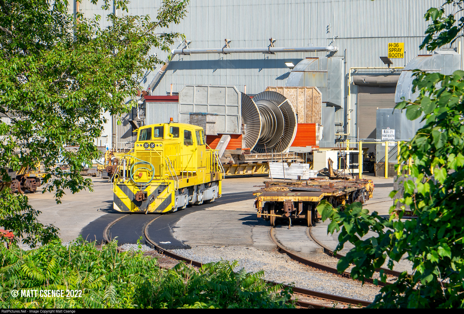 General Electric locomotive no. 21 (GE SL-85, 12/1978) is seen on the north side of the company's Schenectady Works, surrounded by heavy-duty flat cars for transporting the large turbines and generators manufactured at this plant. |