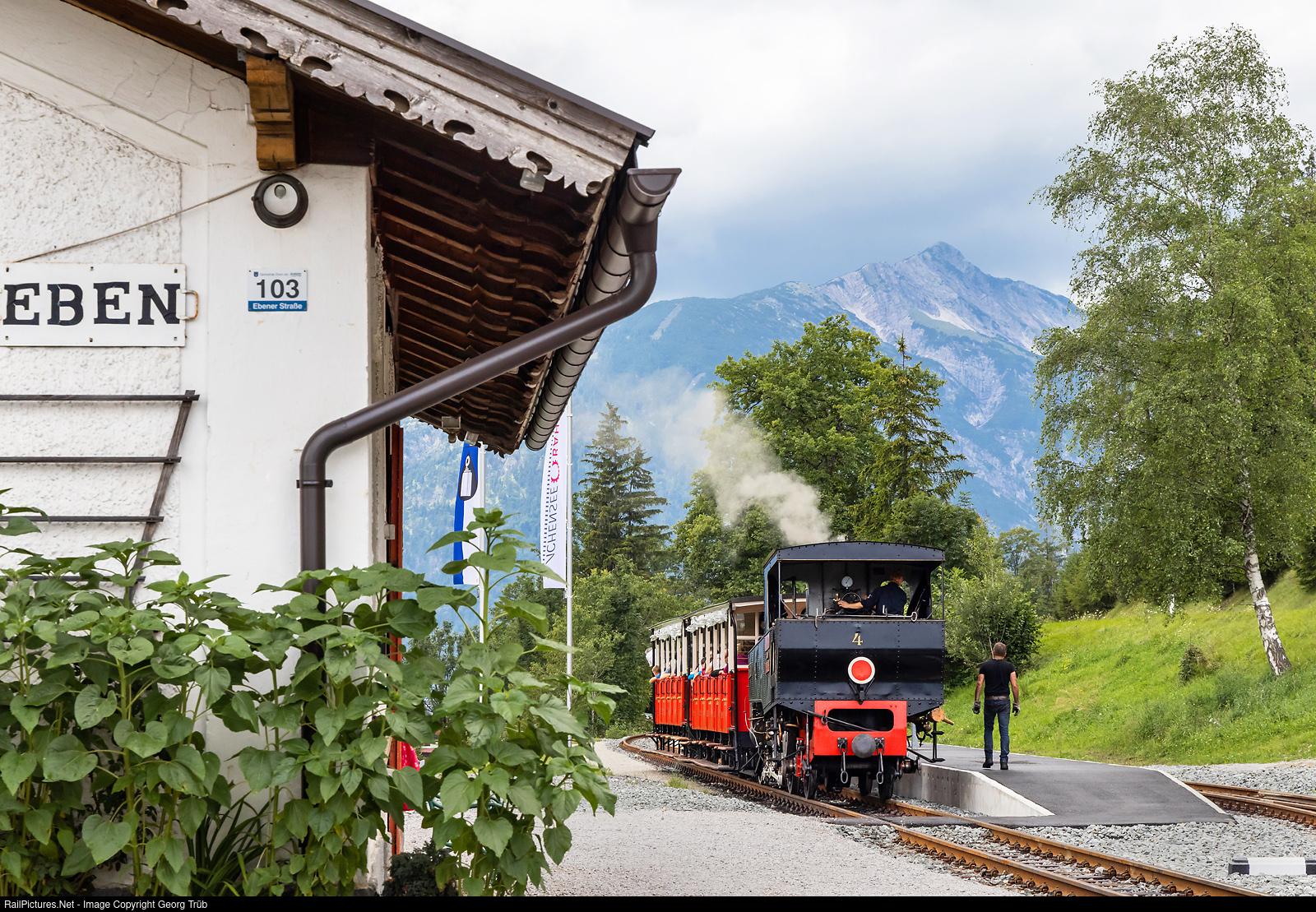 Cogwheel steamtrain of the 1 meter gauge Achenseebahn arrived in Eben im Tirol, end of the rack section, coming up from Jenbach and going to Seespitz (Achensee). The Riggenbach system rack section is 3,5 kilometer long with a grade uf up to 16.0 %, the adhesion section from Eben im Tirol to the Achensee (Seespitz) is about 3 kilometer long with adhesion and maximum 2.5 %. Locomotive # 4 "THEODOR" of 1889 shoved two cars from Jenbach up the rack section. In Eben im Tirol, the locomotive will run around the train to pull the train til Seespitz.
